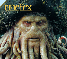 Check out Cinefex.com for the complete skinny on this issue, but the cover speaks volumes, the work ILM achieved with Davy Jones and his tentacles, the motion capture, the sub surface scattering, the animation, lighting, integration, all superbly done. You most likely won't find a mention of the ~50 some odd shots that Tippett Studio did for the show, we didn't even make a studio credit... but a few others scooped up the farmed out work from ILM, a good friend at Method Studios did some sweet work dealing with matte paintings. Pirates 2 came and went and took the booty on pretty much all the box office records, I think it recently exceeded the $1 billion mark worldwide, that's just silly, silly, a silly amount of money. So as Pirates 3 is in the works, the pipeline has been laid out so we should see a lot more fantastic stuph and bigger payoffs in the 3.